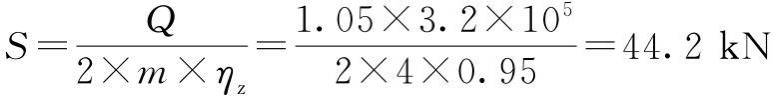 卷筒钢丝绳总拉力:∑S=(Q+Q0)/m×η=(1.05×3.2×105)/4×0.98=85.7kN