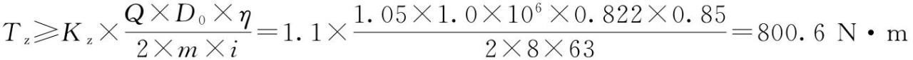 选某国内品牌减速器:(额定功率146kW)i=63,减速器许可的短暂扭矩88kN·m。综上述计算结果可知,减速器的选择符合规范要求。